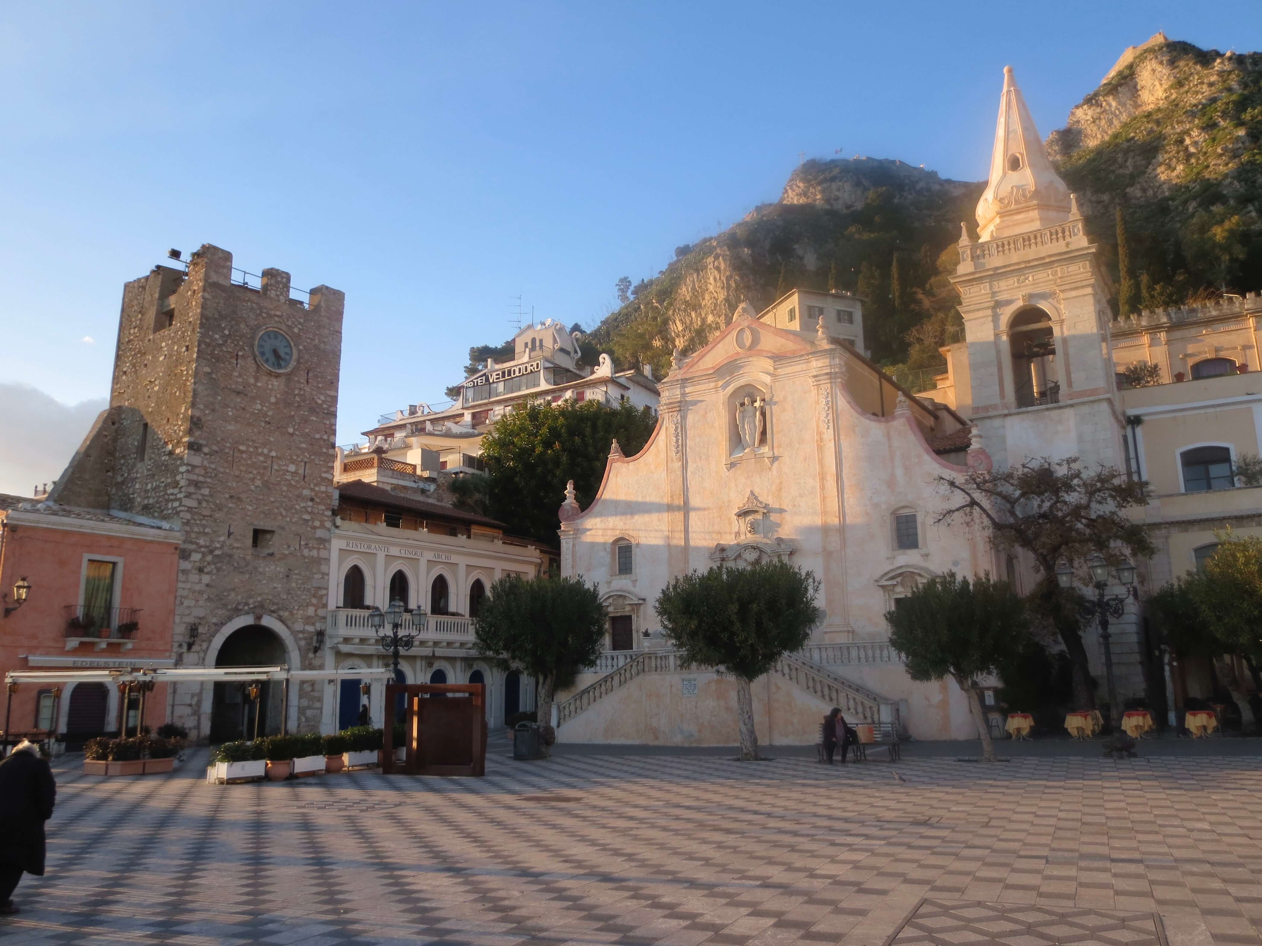 Main Square of Taormina in January.It is possible to see the sights of Taormina in a couple of days. After that, you can move on or stay and enjoy the beach life.